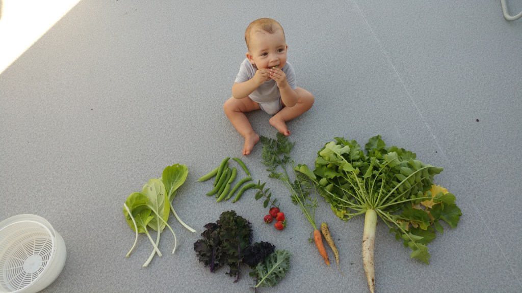 Once again we were blessed with an abundance from the garden with the beans, peas, squash, zucchini, and cucumbers all doing really well. The only real disappointment was the brussels…at least the bugs enjoyed them. The daikon radish was a star performer and was a tasty addition to several garden inspired dinners. Sophie definitely approved of the peas and strawberries!
