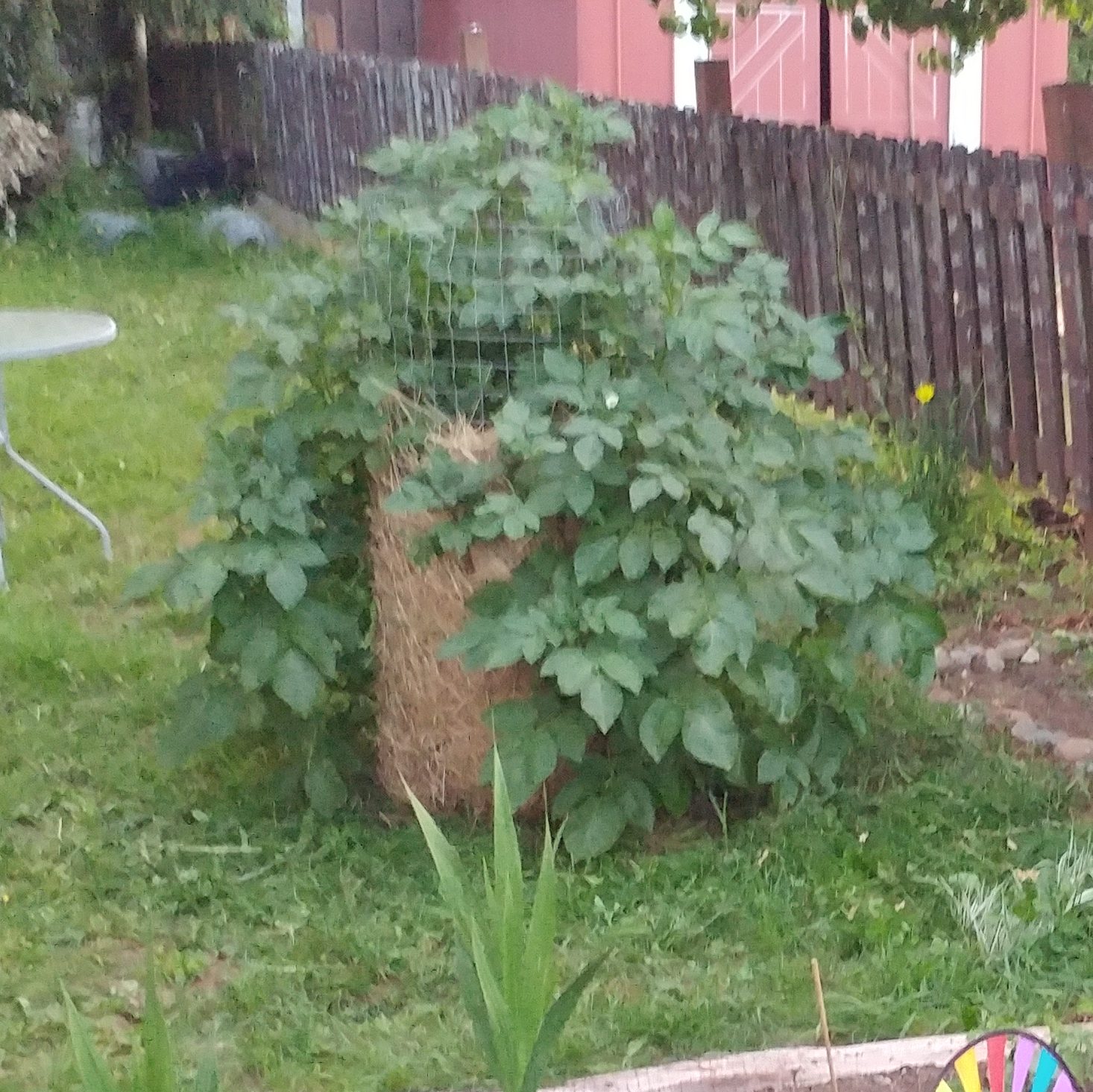 We lined the outside of the cylinder with some hay(just enough to stop the dirt from spilling through) and planted the potatoes in 3 layers about a foot apart. It was great to just plant the potatoes and not have to mound up the plants as they grow. We didn’t know exactly what to expect but we were pleasantly surprised at how well it worked out. The potatoes grew out the sides of the fencing and everyone who visited the garden asked what was growing in there!
